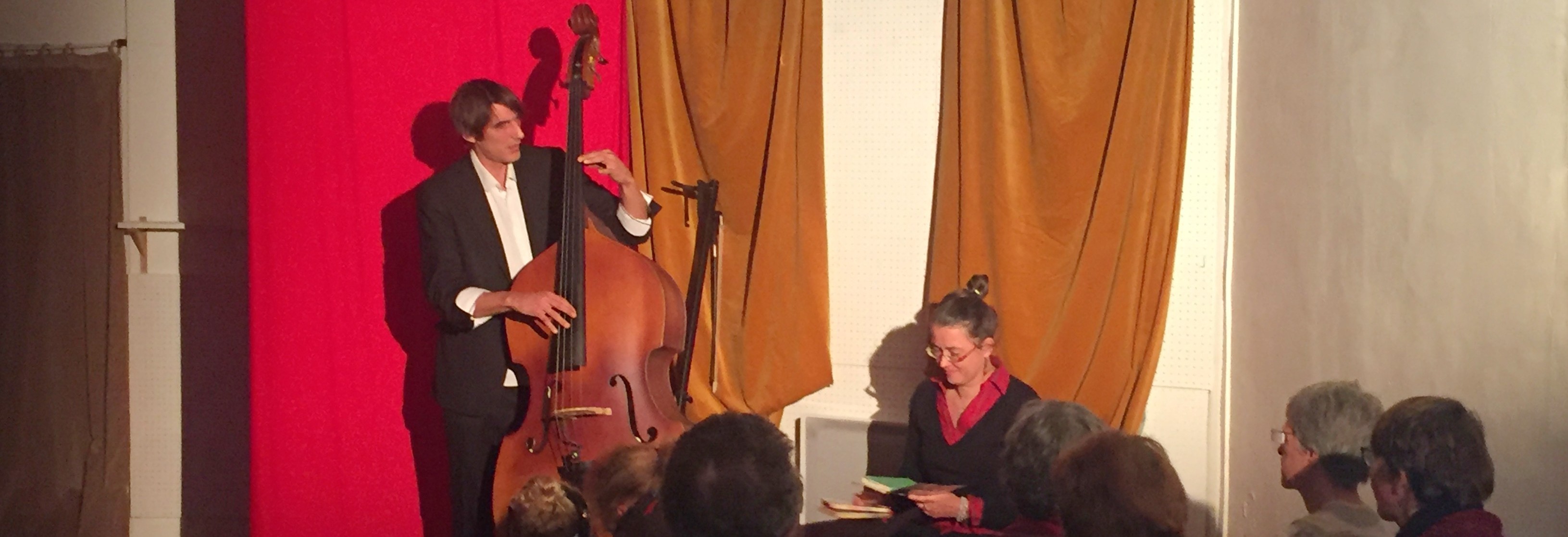 L’Apéro Littéraire s’est déroulé, lui, à partir de 18h30 en présence de 35 personnes. Les trois structures porteuses du projet de résidence artistique étaient elles aussi présentes (la MJC, la Minoterie et la Compagnie les Os Bleus). Une contrebasse accompagnait la voix de la comédienne. Les textes lus sont des extraits des œuvres suivantes :