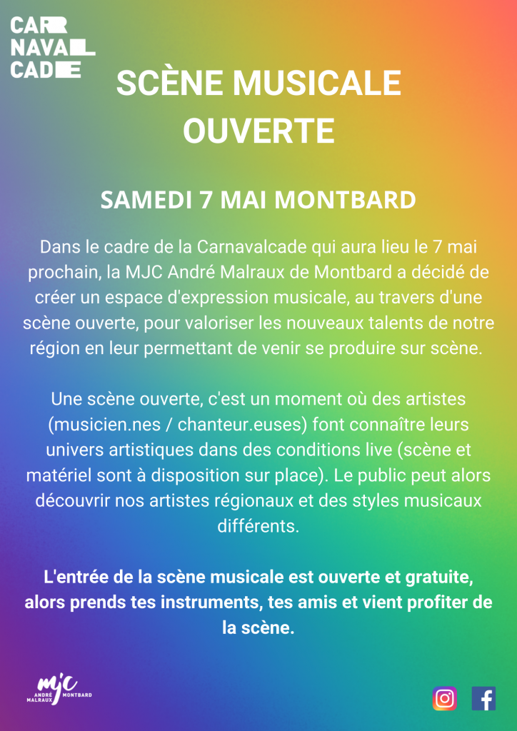 Dans le cadre de la Carnavalcade, la MJC André Malraux de Montbard a décidé de créer un espace d’expression musicale, au travers d’une scène ouverte, pour valoriser les nouveaux talents de notre région en leur permettant de venir se produire gratuitement sur scène.
