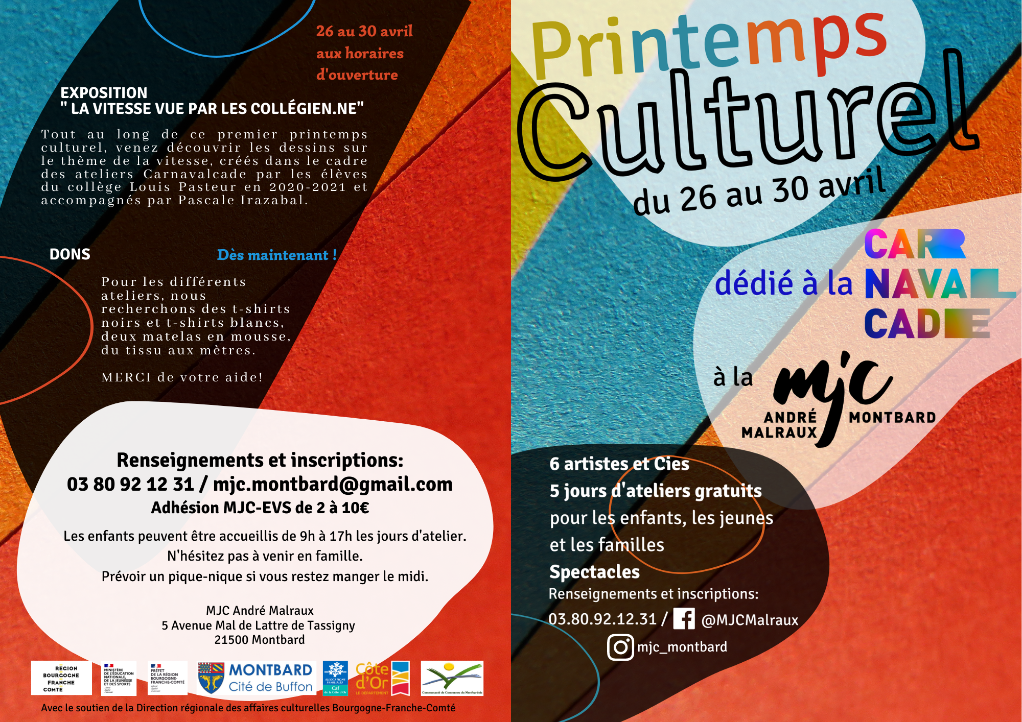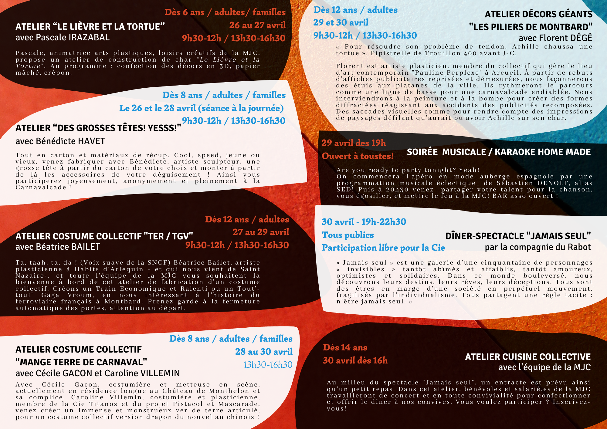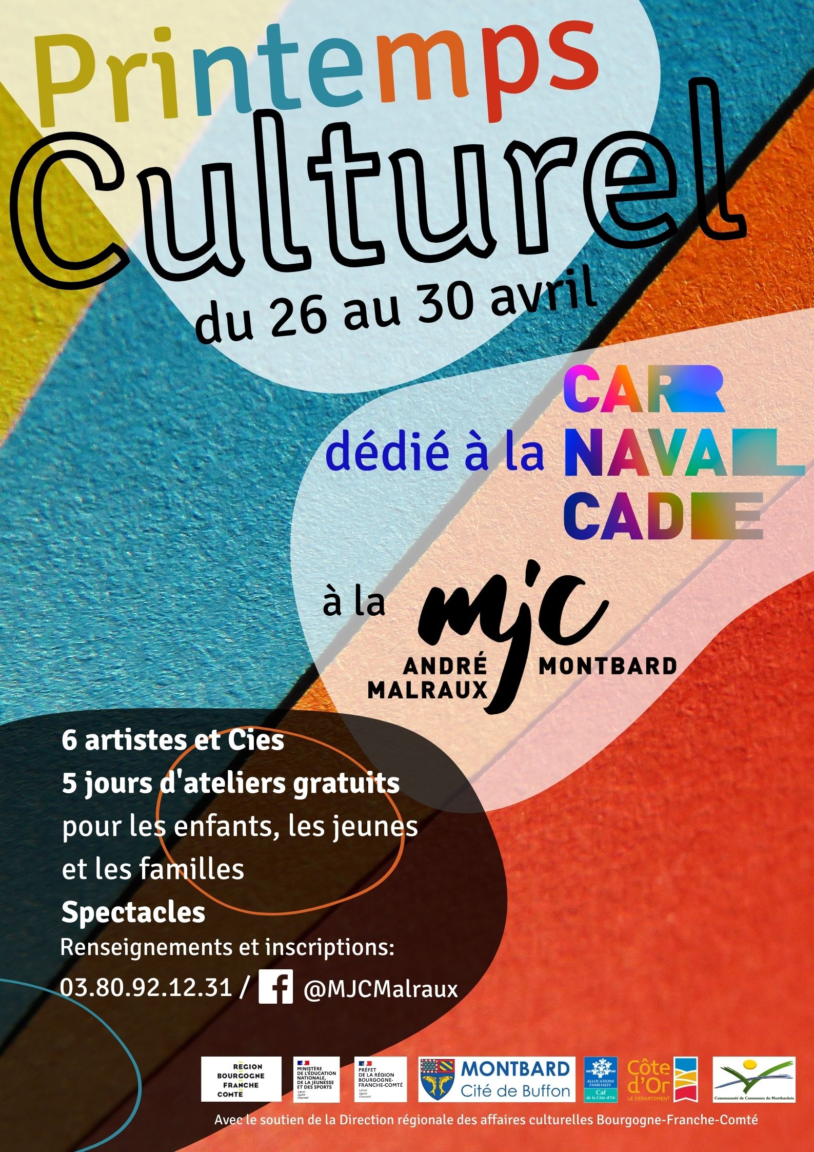 Voici le programme entièrement gratuit, éclectique et ludique que vous propose la MJC André Malraux dans le cadre de ce premier Printemps Culturel dédié à la CARNAVALCADE du 26 au 30 avril avec des ateliers pour enfants, ados, adultes et familles!
